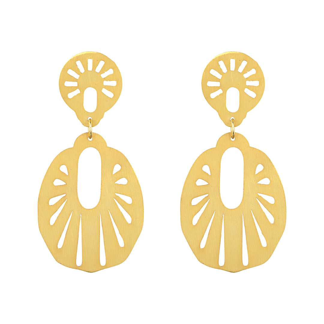 Angelina Gold Earrings showcase intricate cutwork detailing that captures the elegance of vintage design with contemporary craftsmanship. These statement pieces feature delicate geometric patterns rendered in lustrous gold, creating visual depth and movement with every wear. The expert construction ensures durability whilst maintaining the refined aesthetic that makes them versatile enough for both everyday sophistication and special occasions. Perfect for those who appreciate timeless jewellery that transcends seasonal trends.