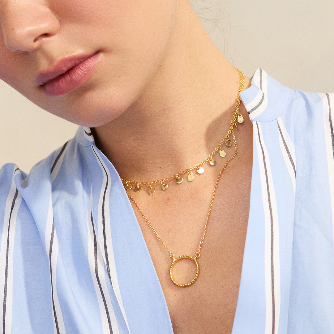 Add a touch of charm to your everyday look with the Nia Gold Ring Pendant Necklace. Featuring a textured delicate gold ring pendant on a thick gold chain, this short necklace is perfect for layering or wearing solo. Its playful design brings effortless style to any outfit, making it your new go-to accessory.