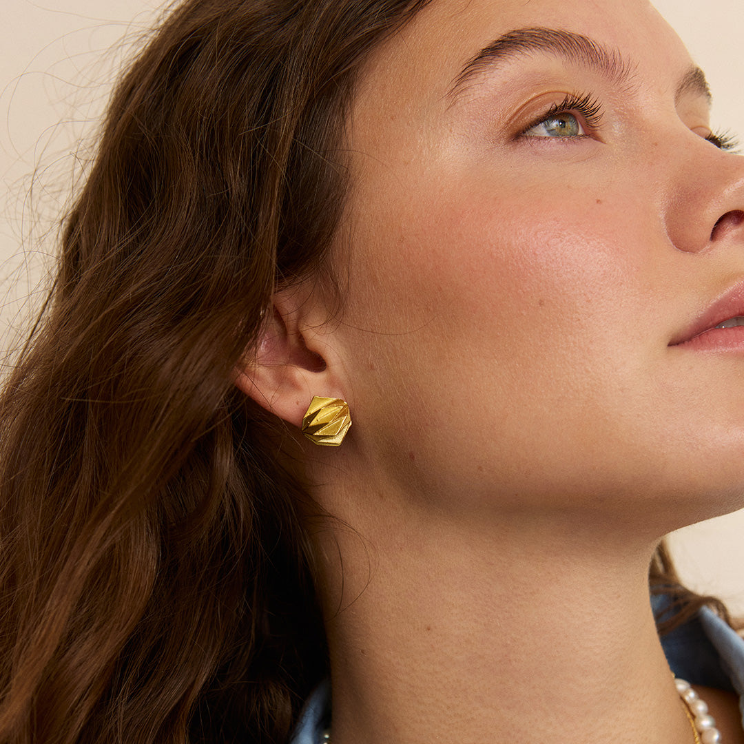 These stud earrings feature a geometric origami-inspired design, showcasing precise craftsmanship and modern elegance.