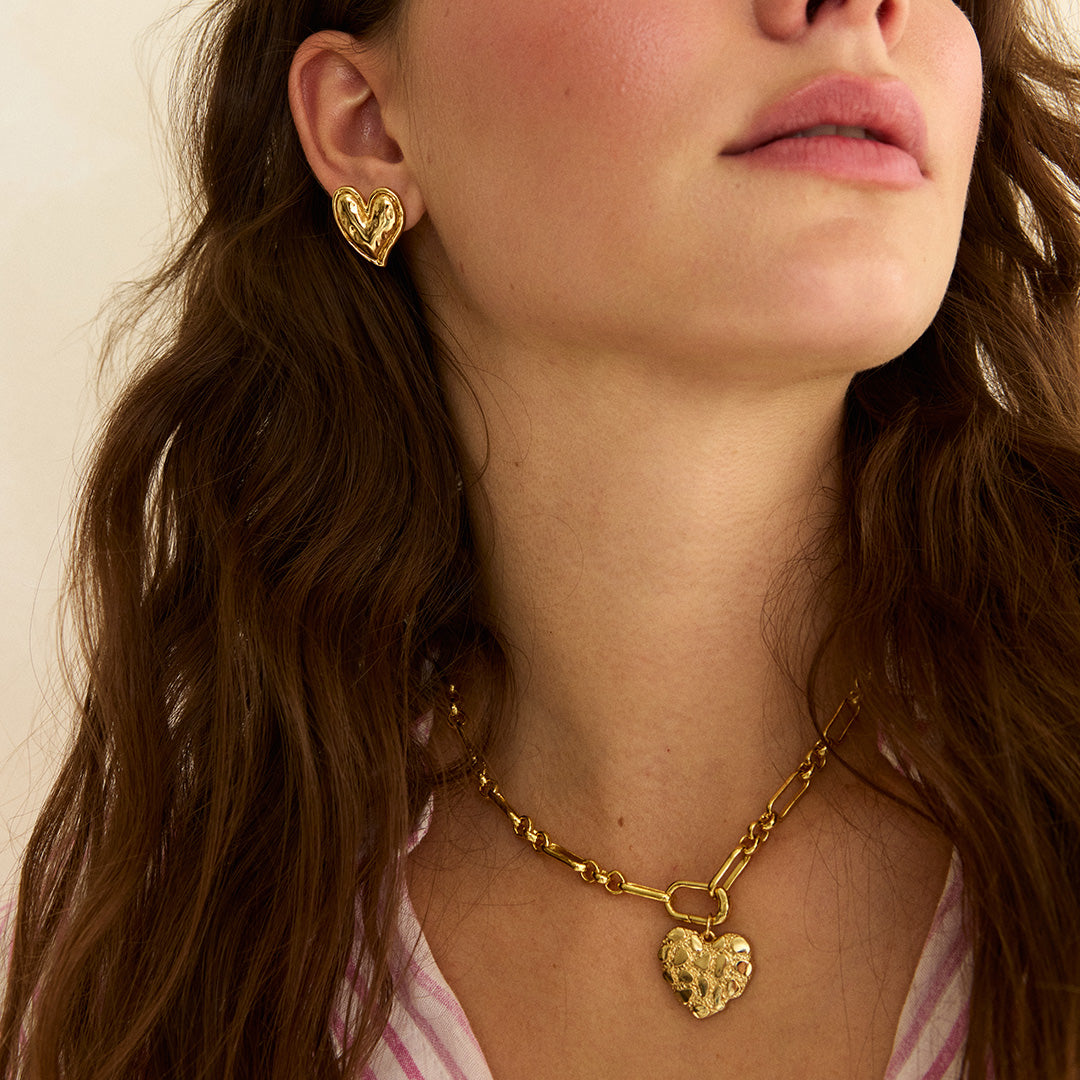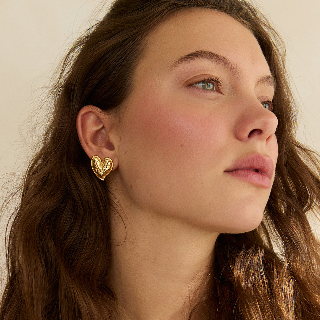 These textured gold heart earrings offer charming stud design perfect for daily wear, adding a touch of delightful elegance to your everyday style.