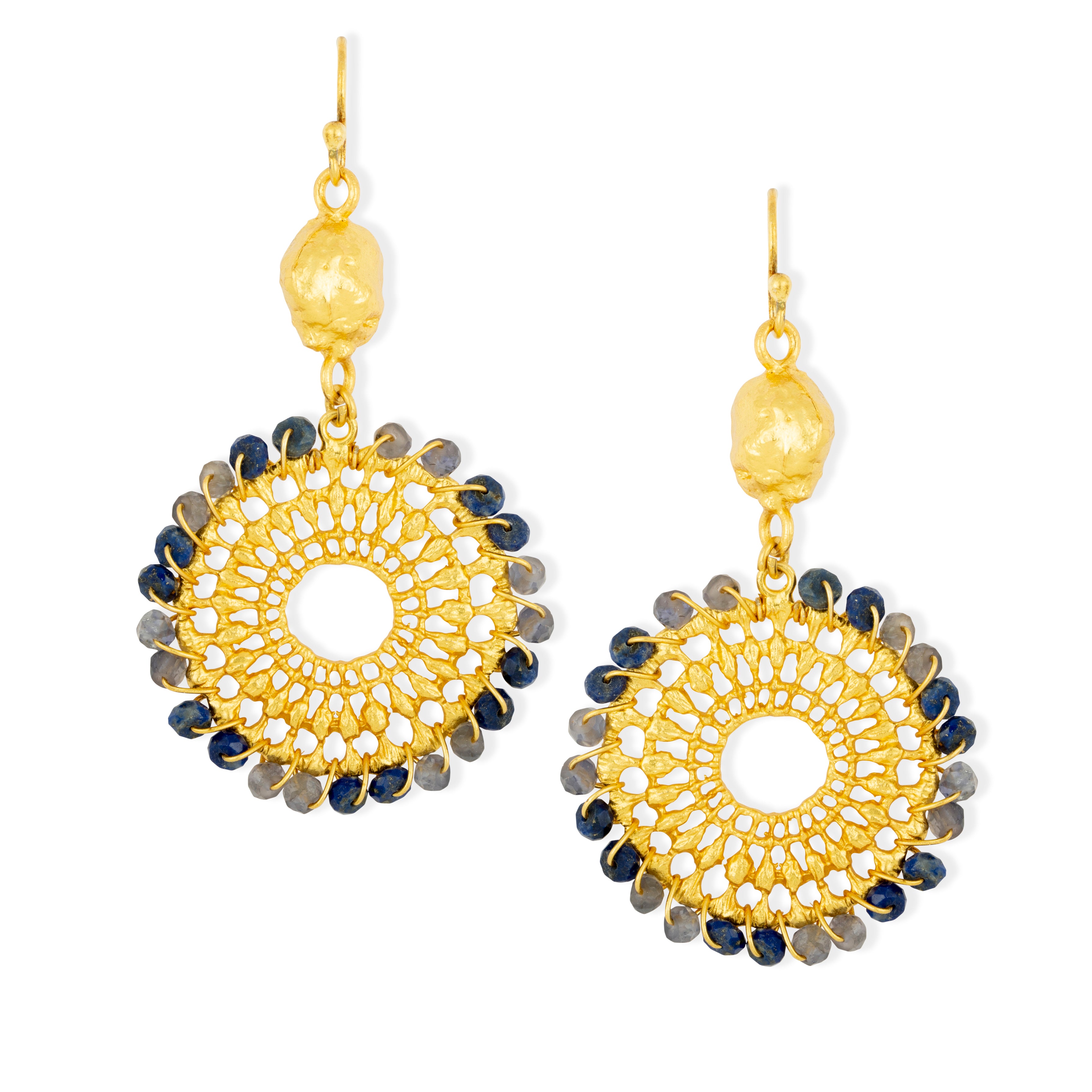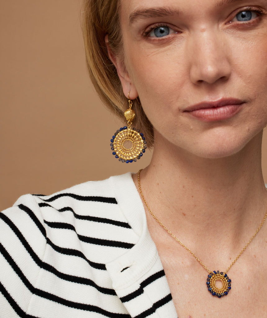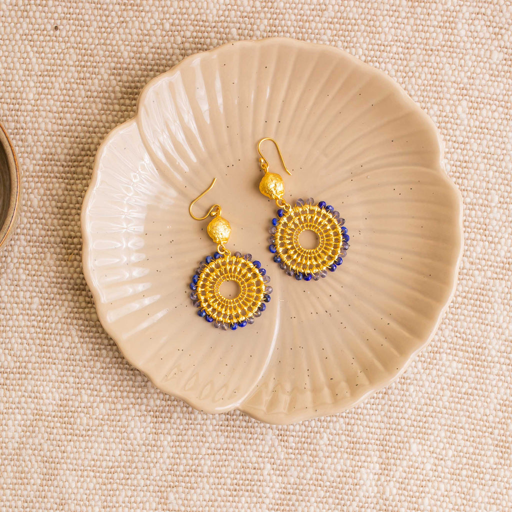 These statement gold charm earrings showcase expertly handwoven iolite semi-precious beads encircling a meticulously crafted sunburst frame, creating a refined statement piece.