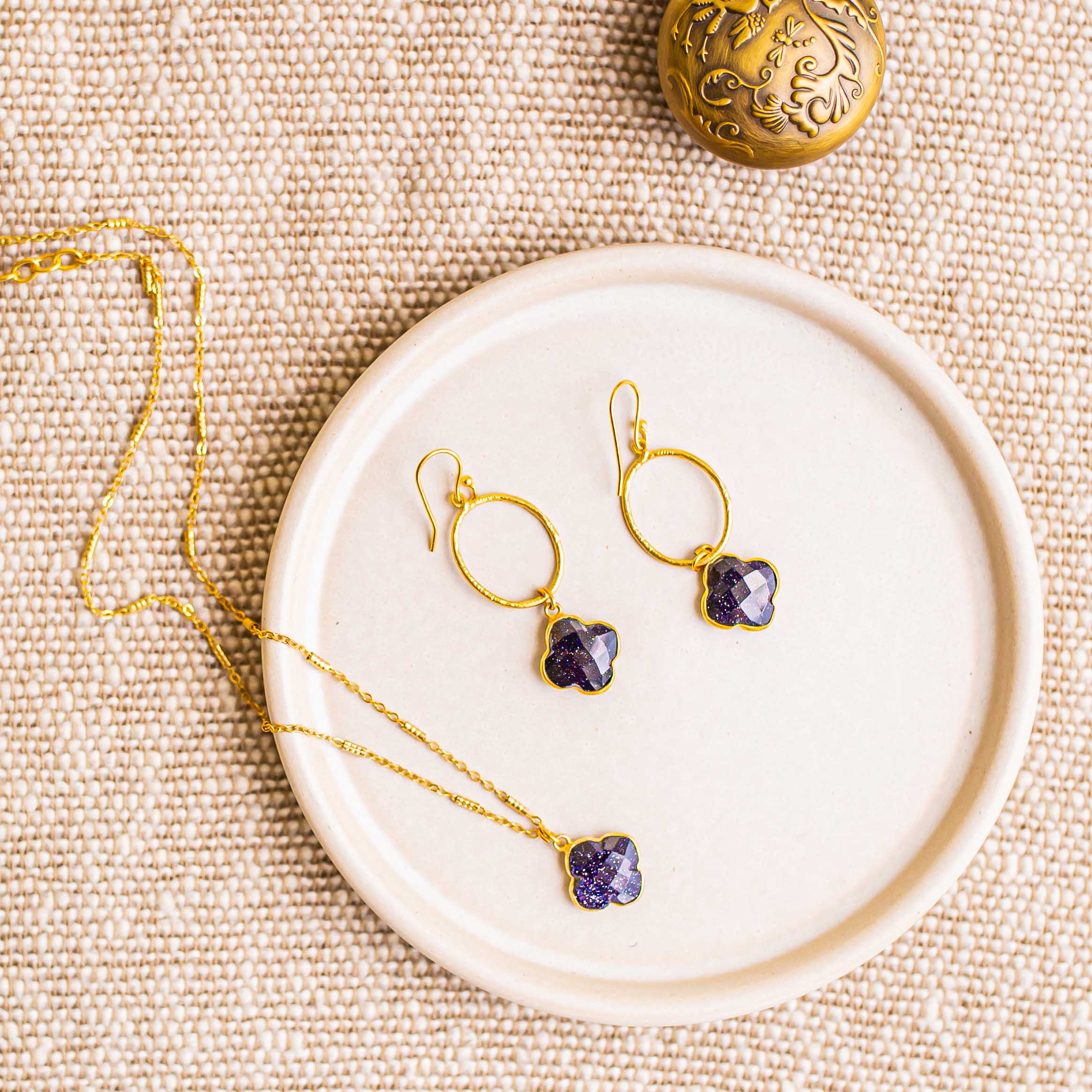 This necklace features a clover-shaped pendant crafted from Navy Sunstone, a natural gemstone with a shimmering midnight blue hue. The pendant is suspended from a finely crafted 22-carat gold-plated chain, combining elegance with artisanal craftsmanship. Each piece is meticulously handmade, reflecting expert attention to detail.