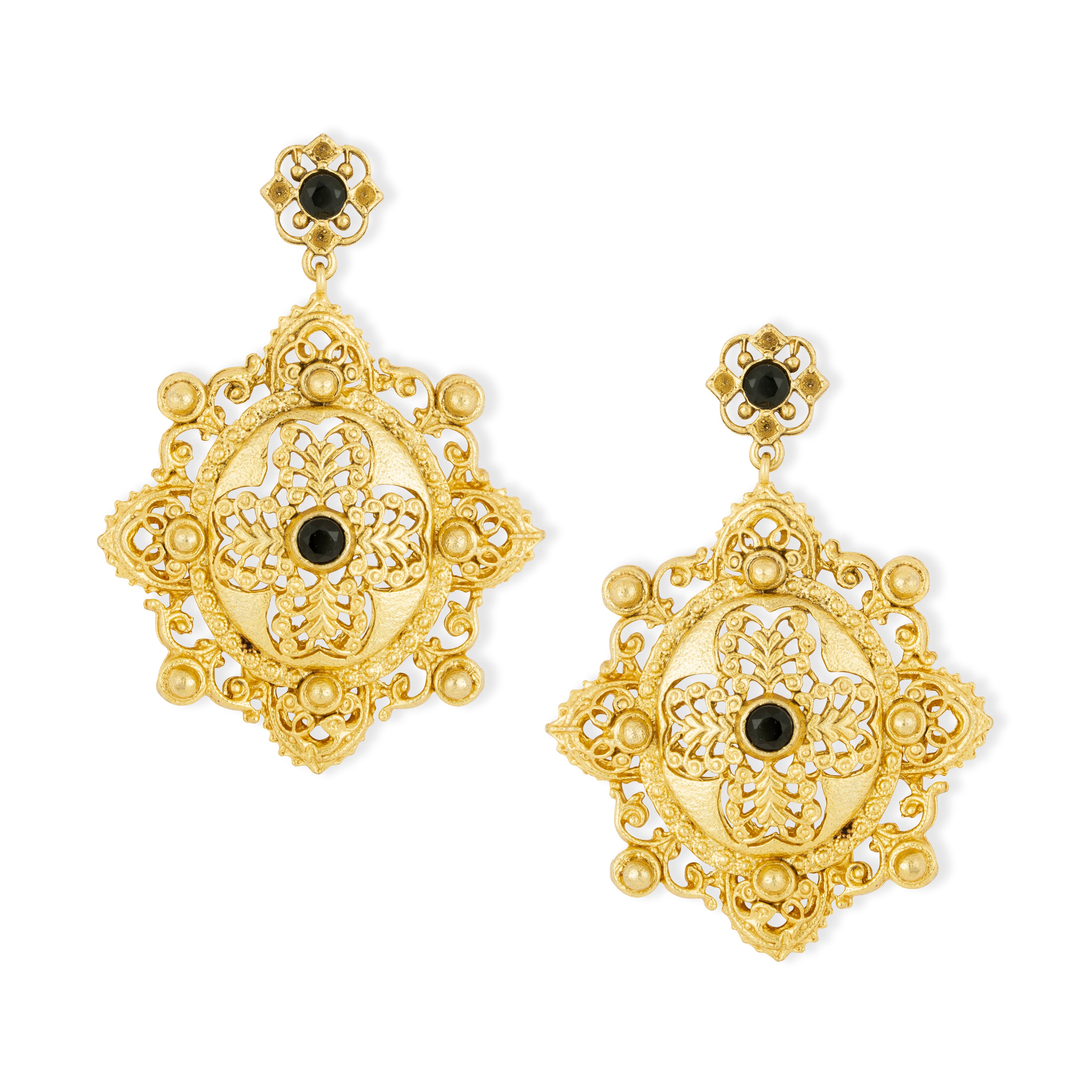 These statement earrings feature a vintage lace brooch design, elegantly adorned with black onyx gemstones for a refined and timeless look.