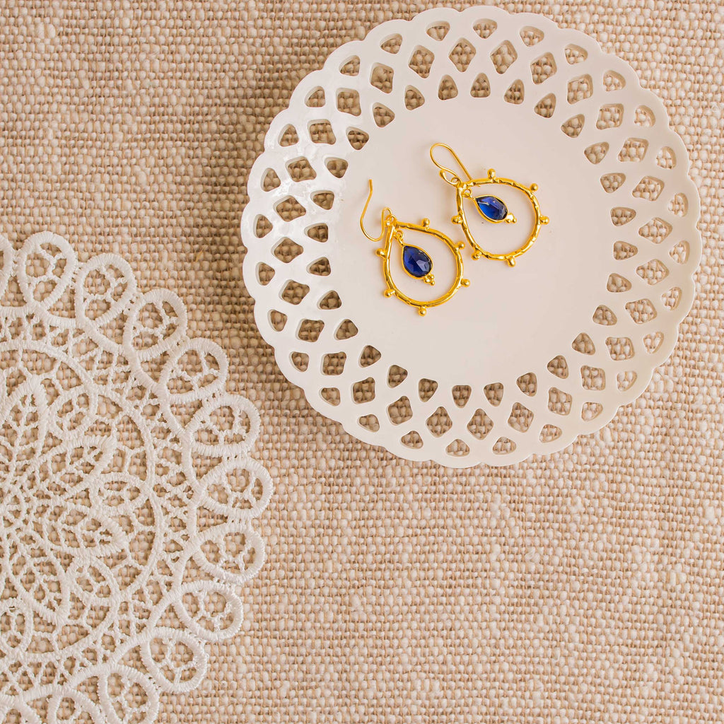 These playful dot teardrop frame earrings feature a petite navy Iolite stone nestled right in the center. A charming, delicate accessory perfect for everyday sparkle.