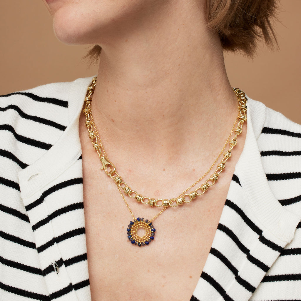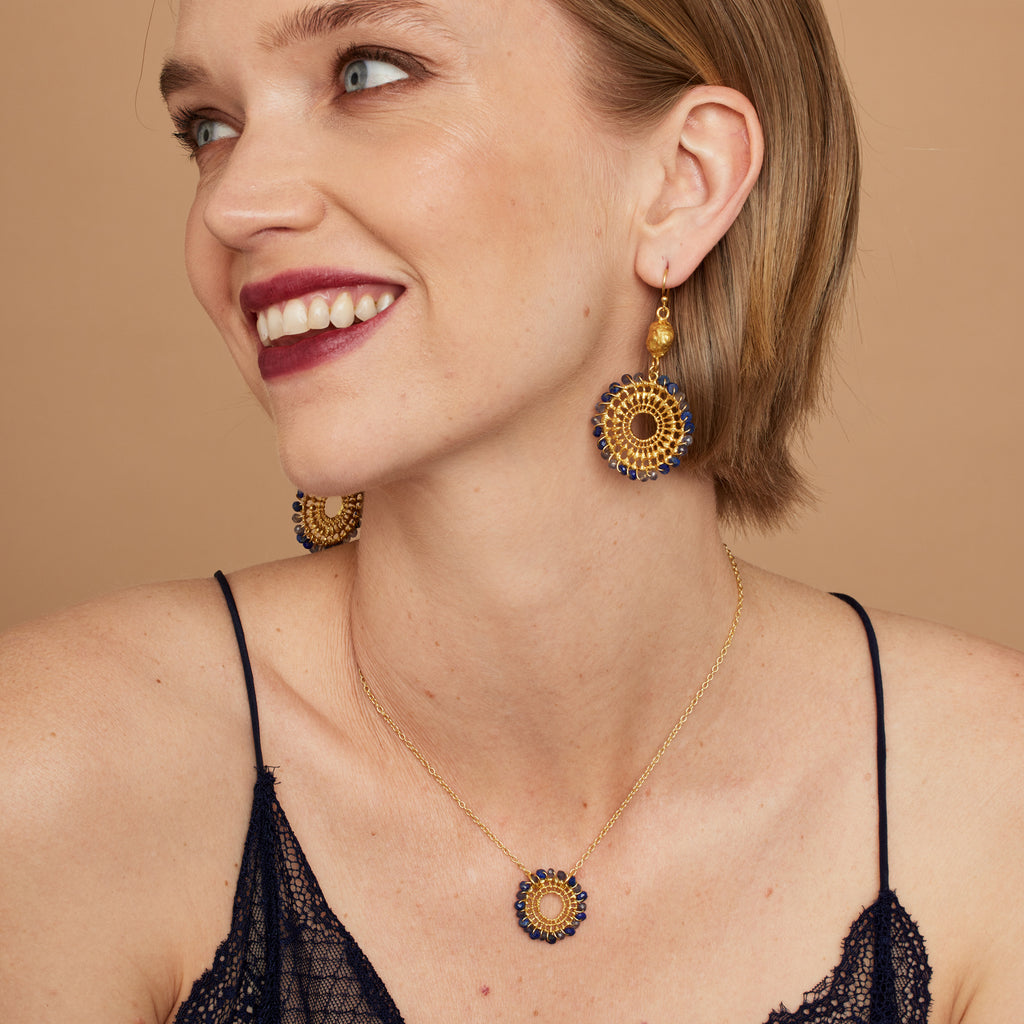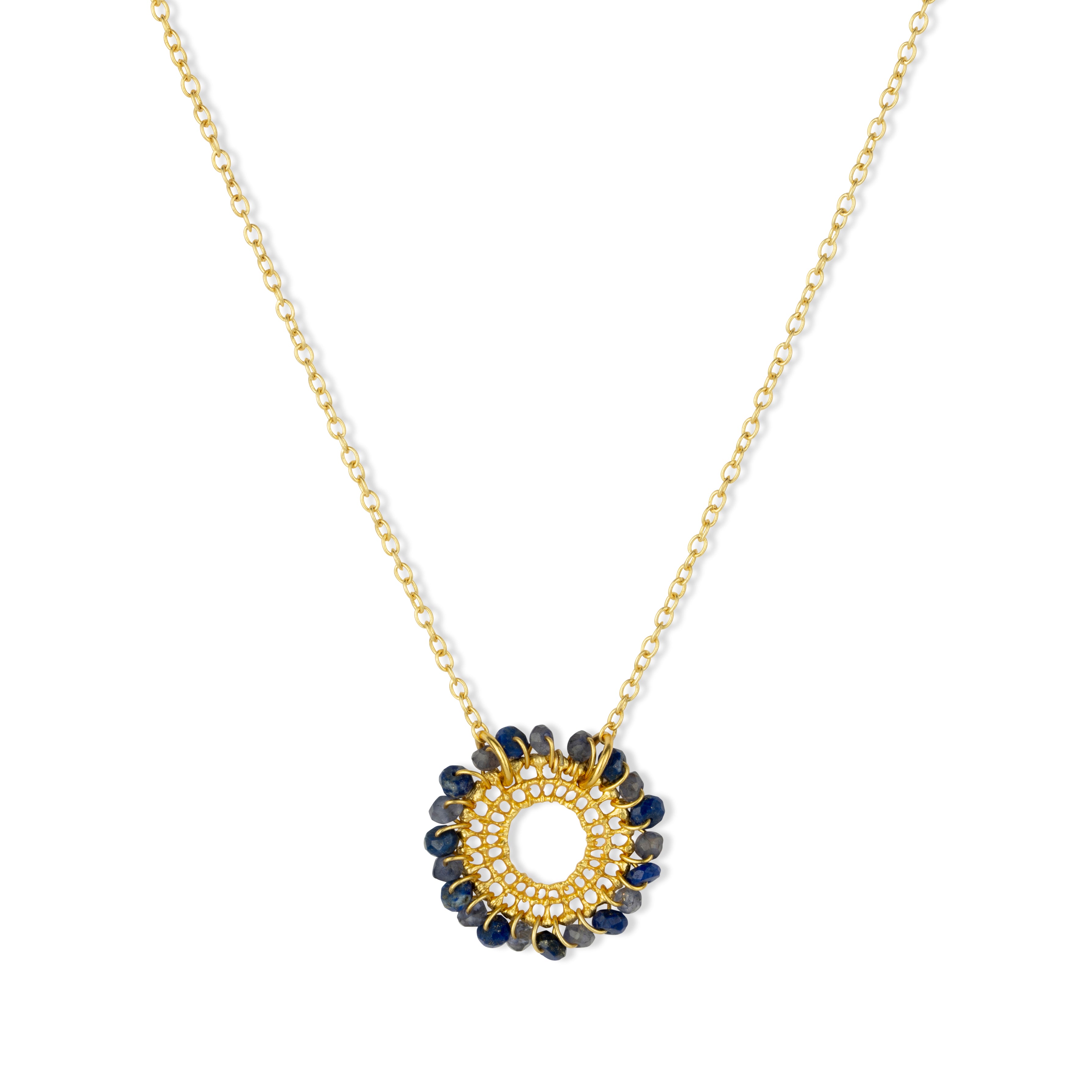 This handmade necklace features our signature looped beads on a filigree charm. Adorned with tiny iolite gemstone and crystal beads on a short chain this necklace will be a unique signature accessory. Build a set with matching earrings from this range.