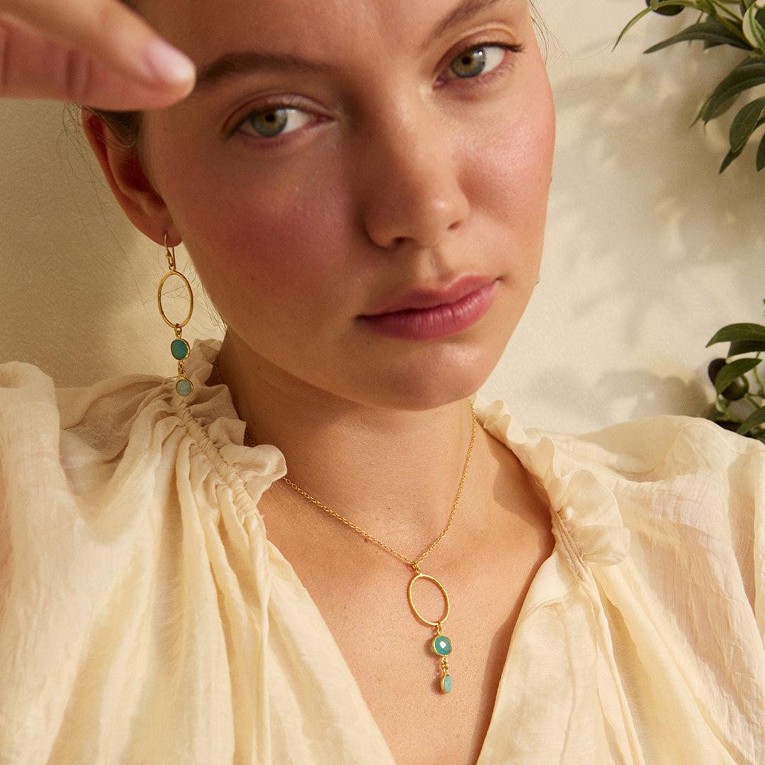 This medium-length gold necklace showcases a refined gold ring charm, adorned with two faceted gemstones: aqua chalcedony and amazonite. Its delicate design offers a distinctive elegance. To get the full look coordinate with a set of matching earrings.