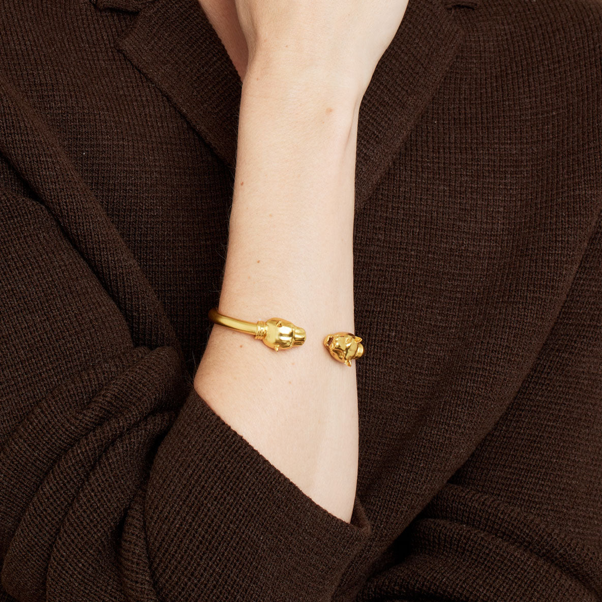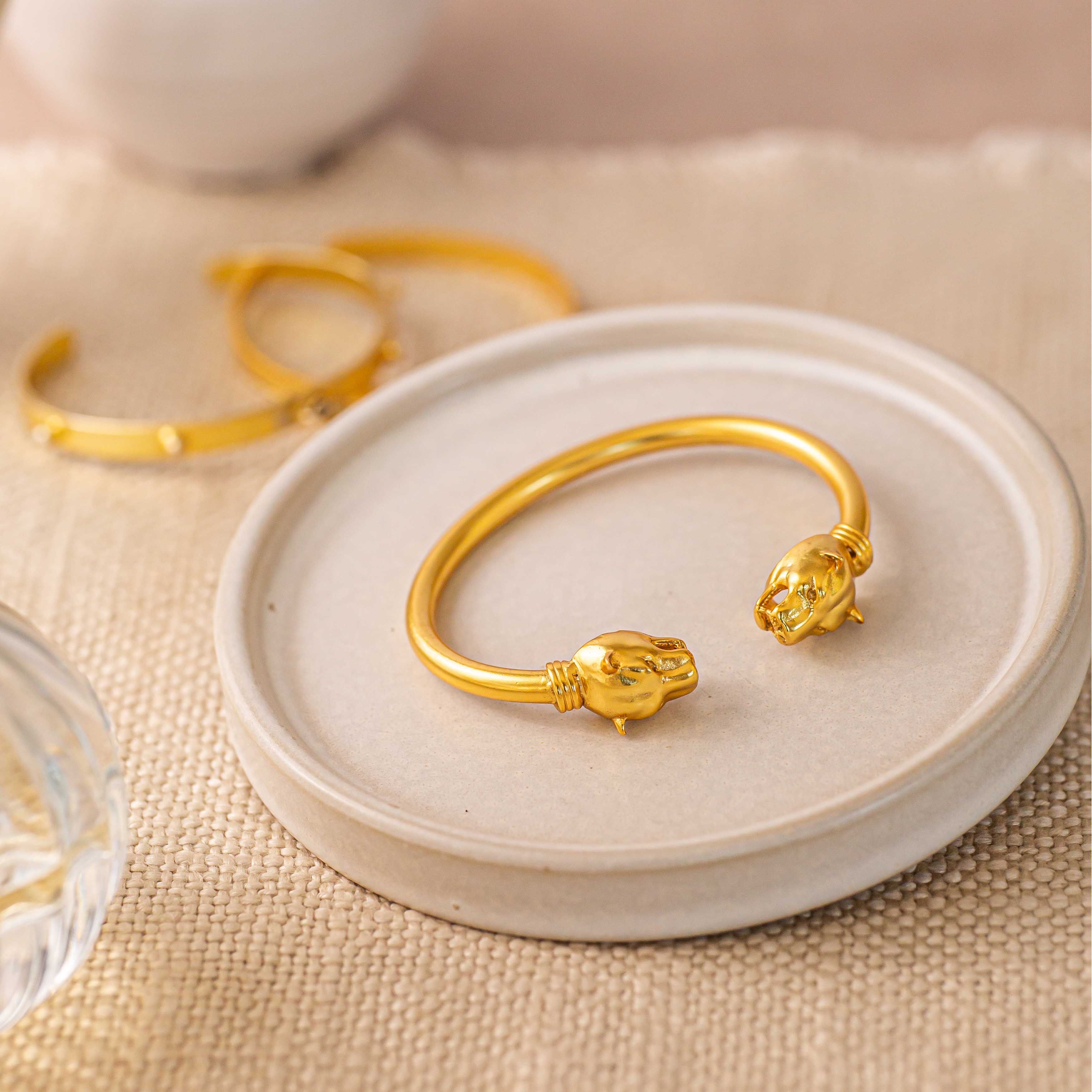 This open bangle features brushed gold with detailed panther head accents, embodying a vintage-inspired design.