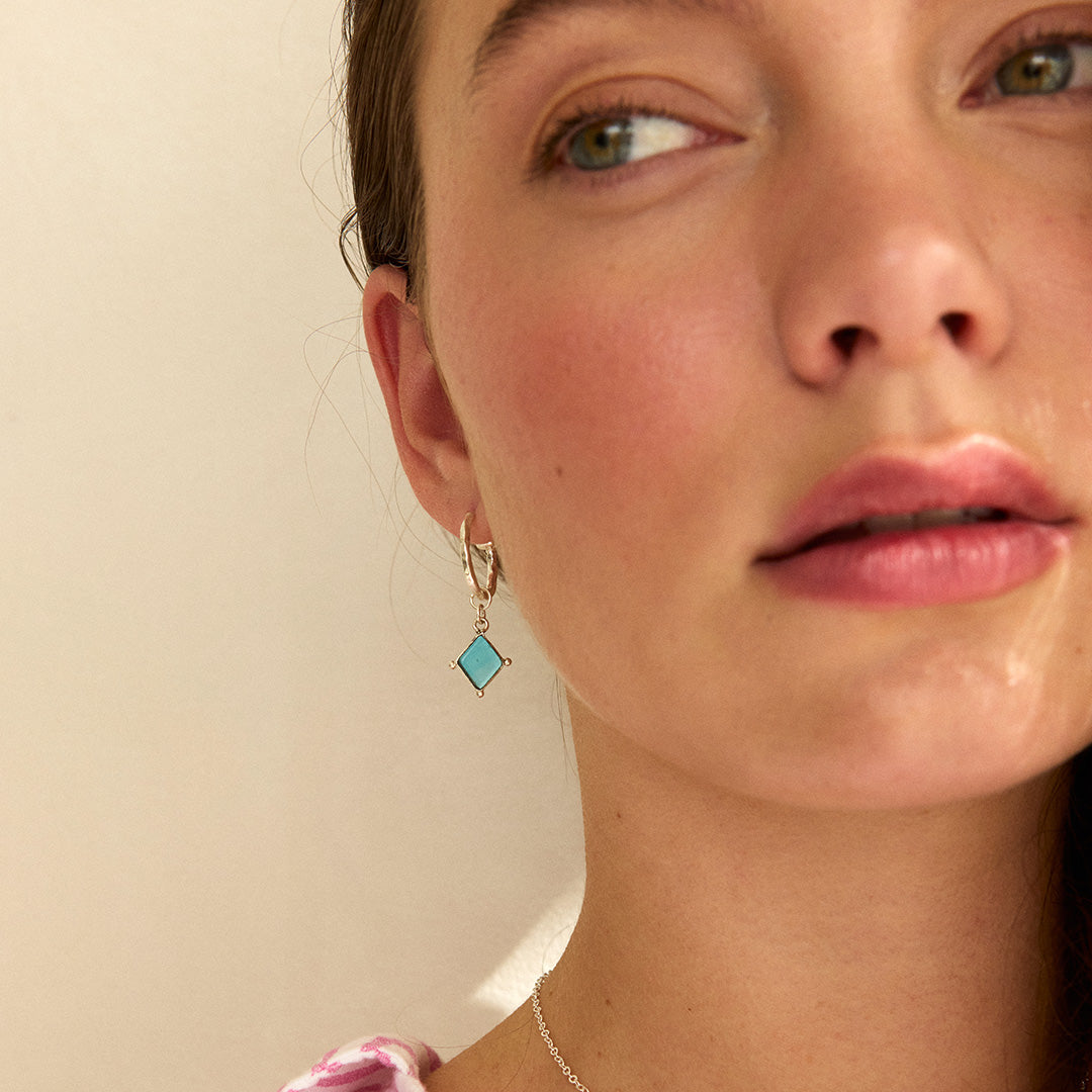 Elegant hoop earrings featuring a detachable diamond-shaped charm adorned with brilliant blue topaz stones. Crafted in silver plate, these versatile earrings offer two styling options—wear the charm attached for a statement look, or remove it to showcase the refined hoop alone. The flat-cut topaz stones catch light beautifully, adding a touch of understated luxury to any ensemble.