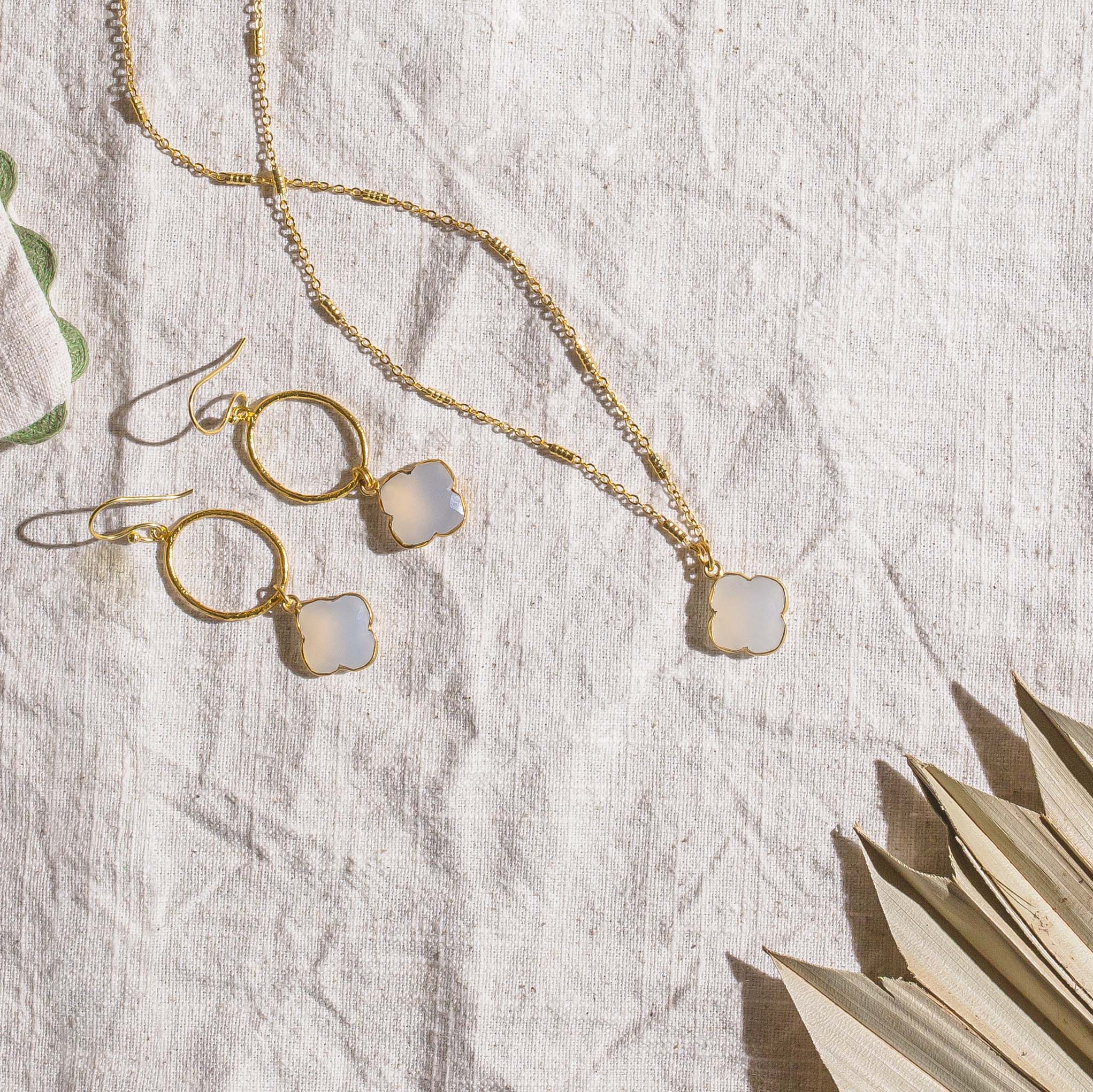 Delicate white chalcedony takes centre stage in this charming clover-cut pendant necklace. The soft, milky gemstone catches the light beautifully, while the shorter chain length keeps the focus right where it belongs—on that gorgeous stone. Perfect for layering or wearing solo, it's a sweet addition to any jewellery collection.