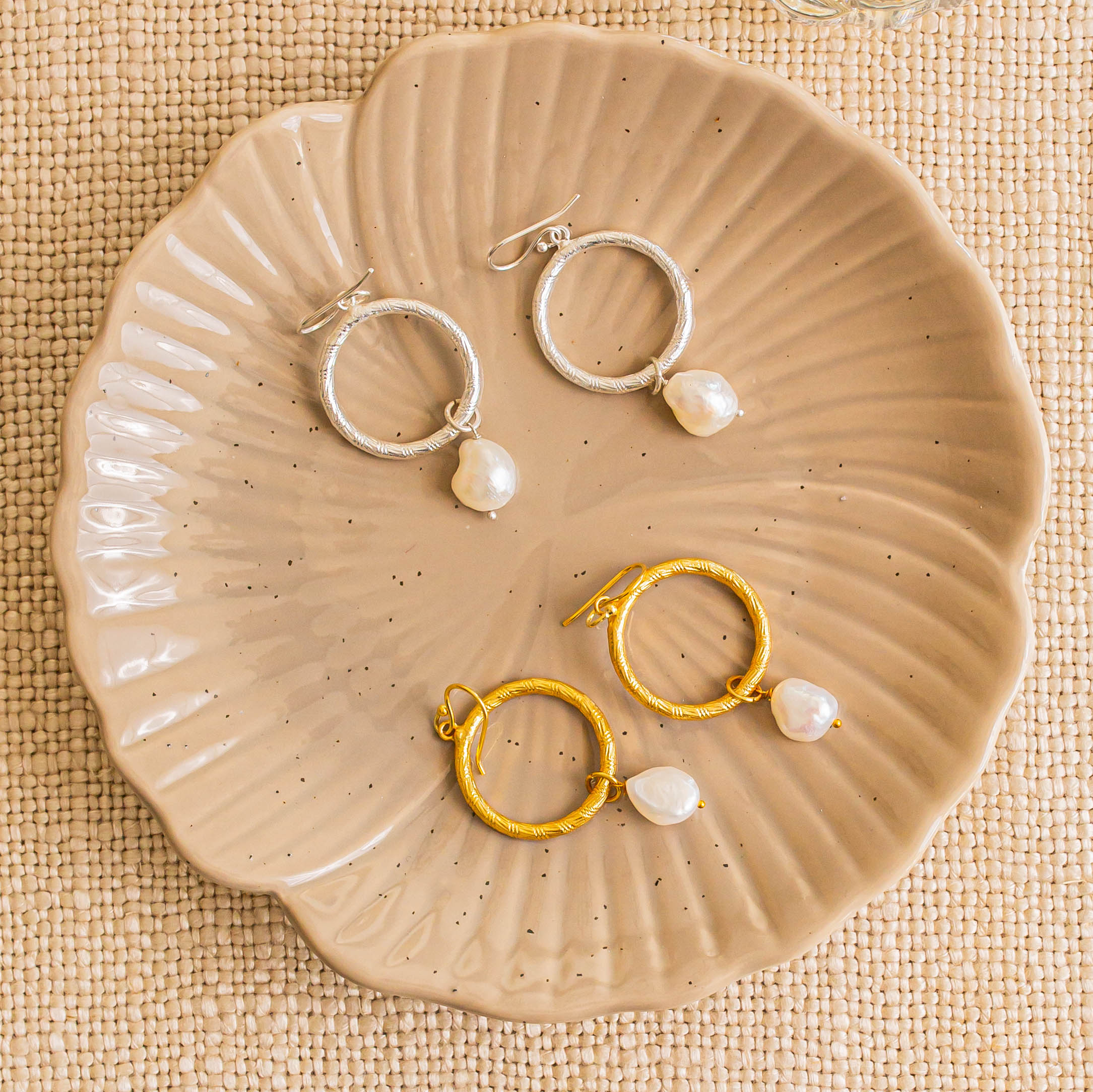 Textured silver plated frame drop earrings with a freshwater pearl. Our Margot hoops are classic and elegant with a touch of that bohemian flair that is the Ashiana signature. Wear them with your hair up to enhance the freshwater pearls natural beauty.