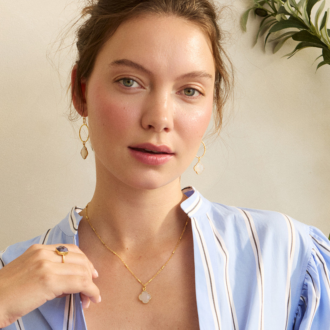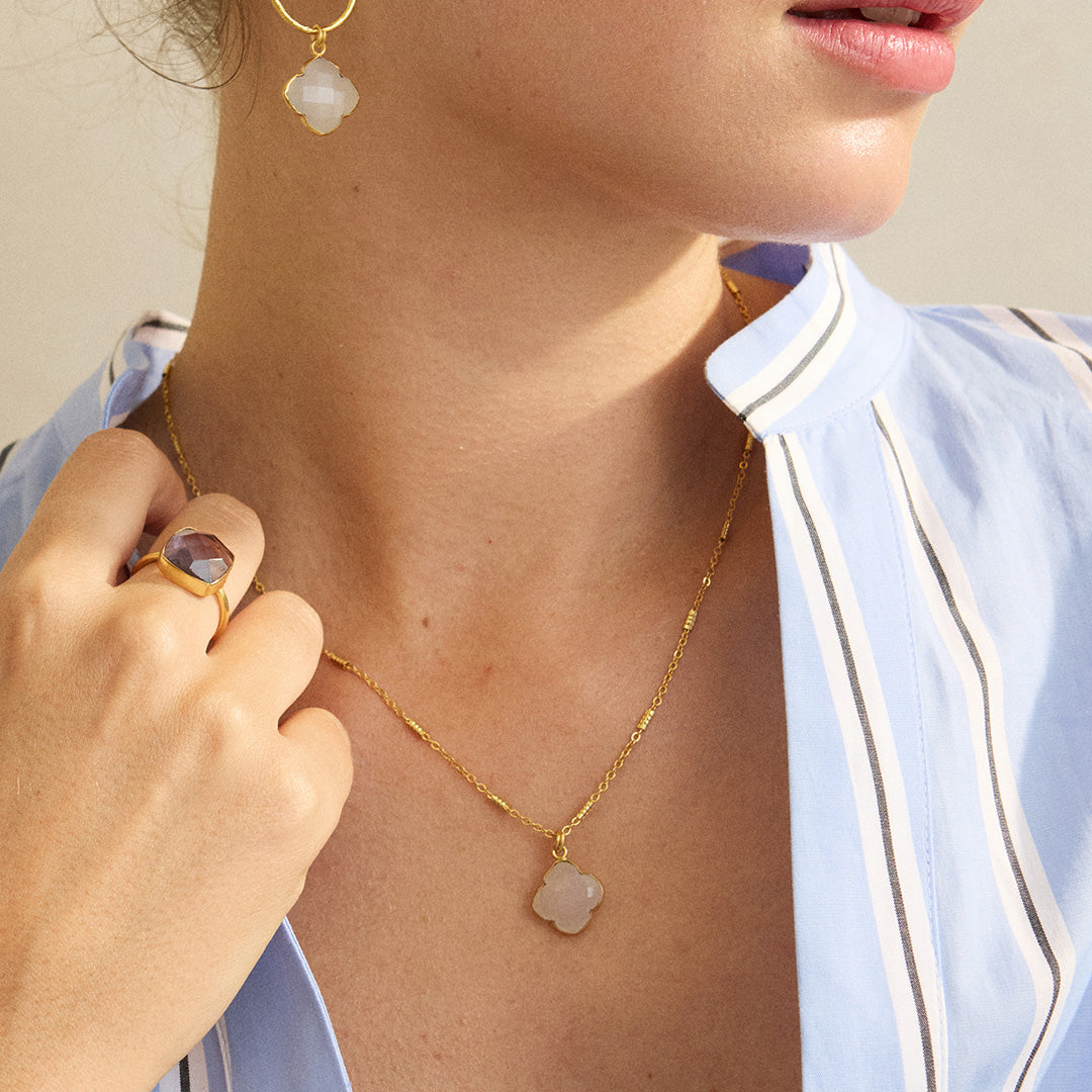 Delicate white chalcedony takes centre stage in this charming clover-cut pendant necklace. The soft, milky gemstone catches the light beautifully, while the shorter chain length keeps the focus right where it belongs—on that gorgeous stone. Perfect for layering or wearing solo, it's a sweet addition to any jewellery collection.