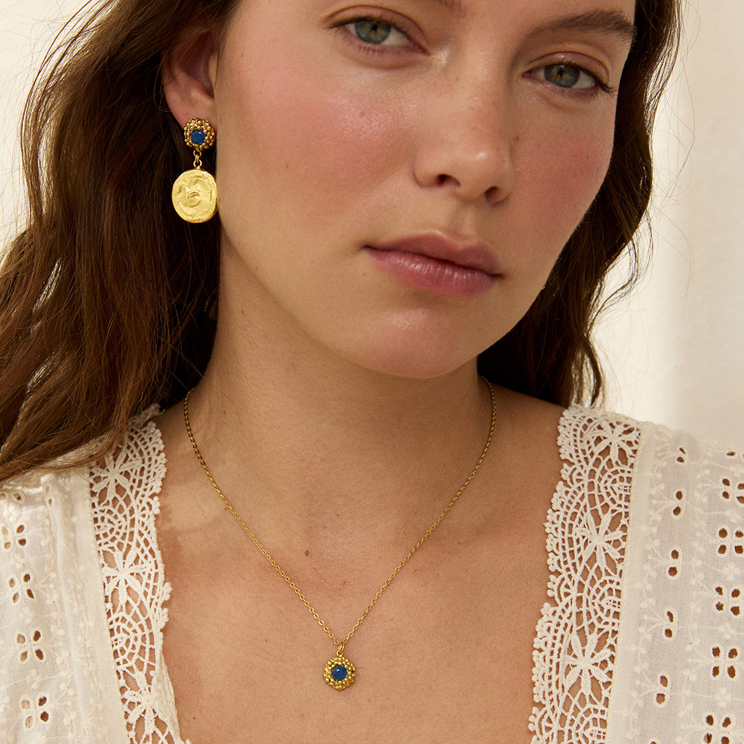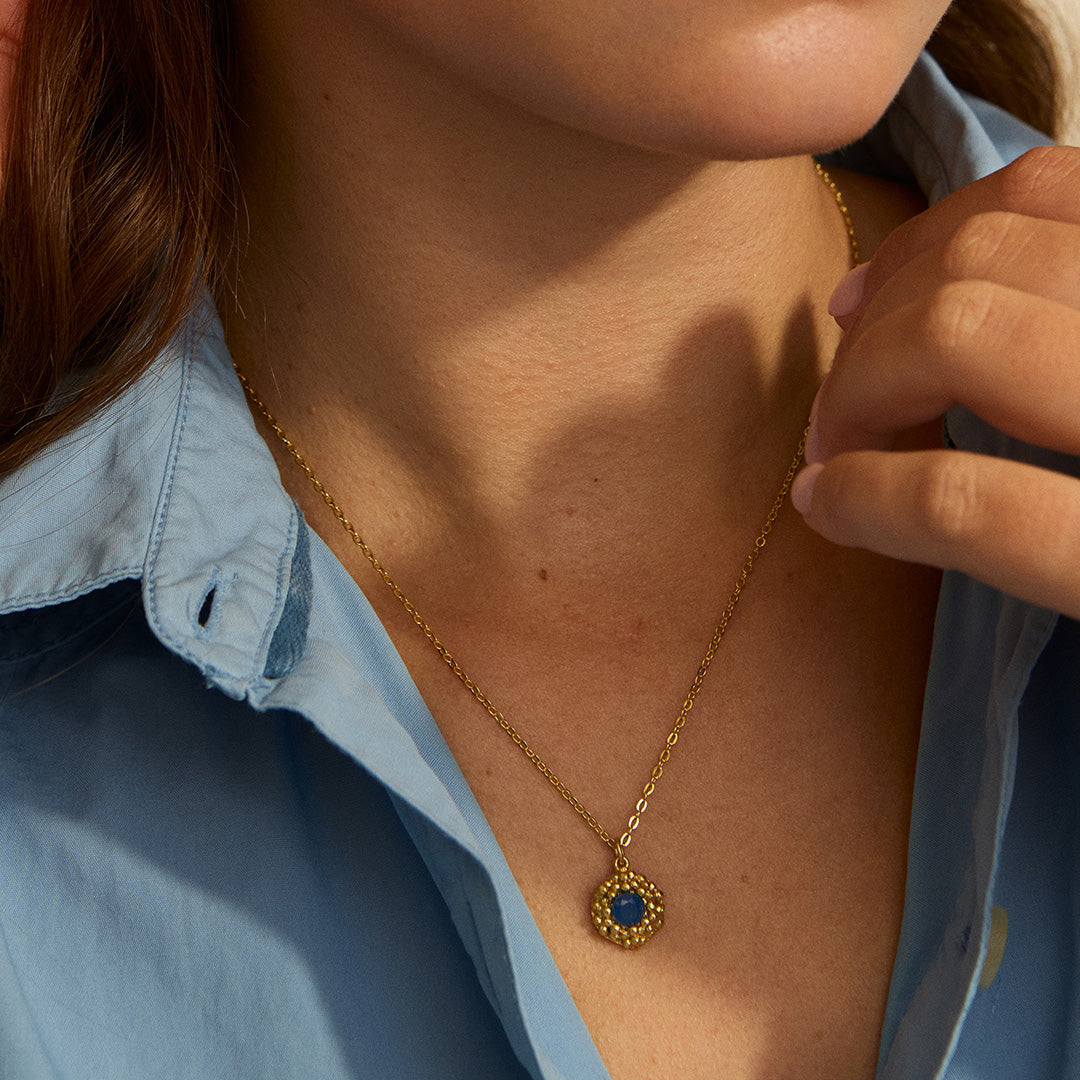 The Maine Gemstone Flower Charm Necklace features a delicate gold-plated chain adorned with a finely crafted flower pendant, centered with a striking blue jade gemstone. Its elegant yet understated design makes it an ideal accessory for everyday wear, adding a touch of sophistication to any outfit. The necklace is part of the Maine collection, which includes coordinating earrings, rings, and bracelets, allowing you to create a harmonious and polished look.