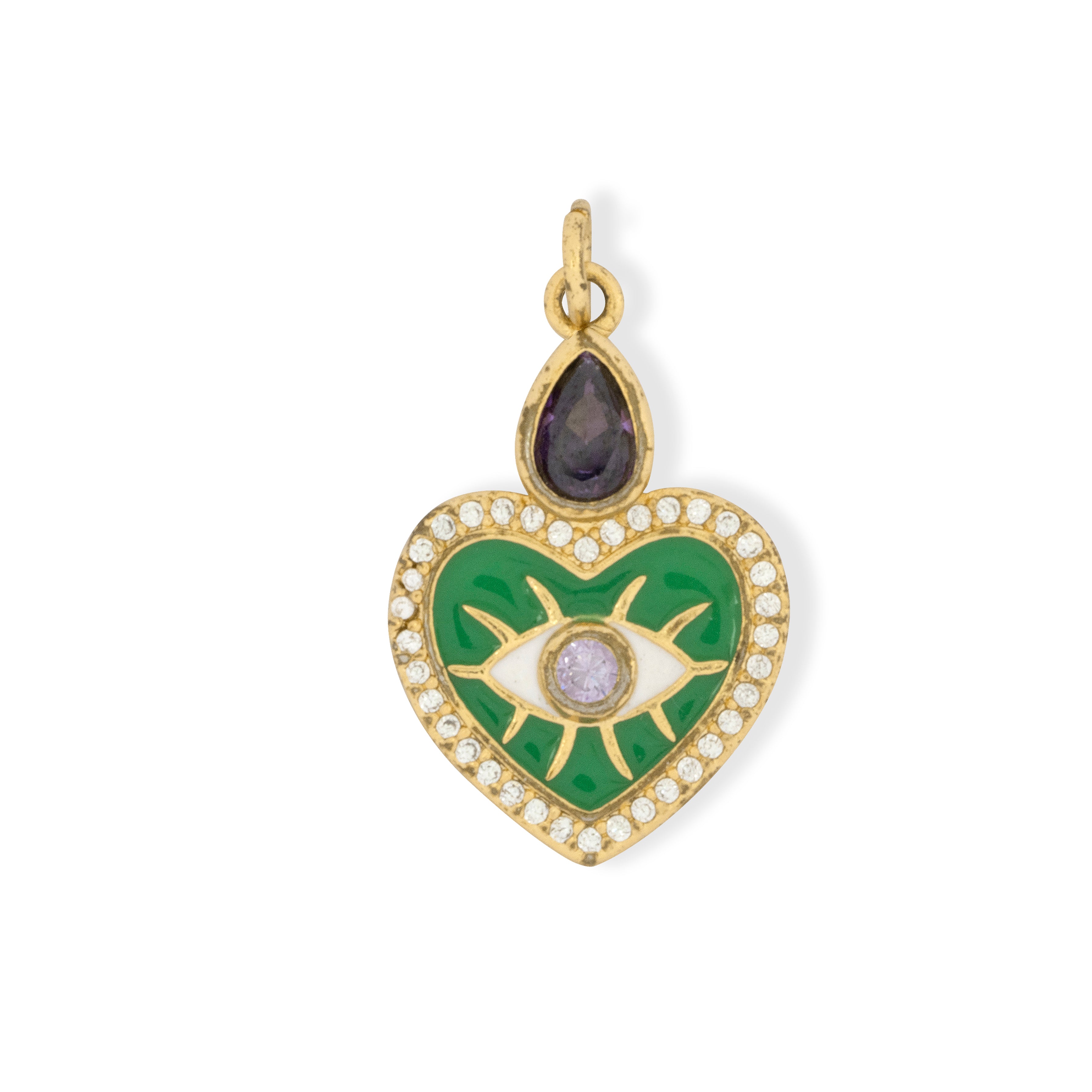 Spread a little magic with this delightful charm duo. Featuring a vibrant green sacred heart adorned with a delicate rose stone, paired with a protective evil eye motif, it's your personal talisman for good vibes and good fortune. Mix and match with our Design Your Own bases to create a charm that's uniquely you.