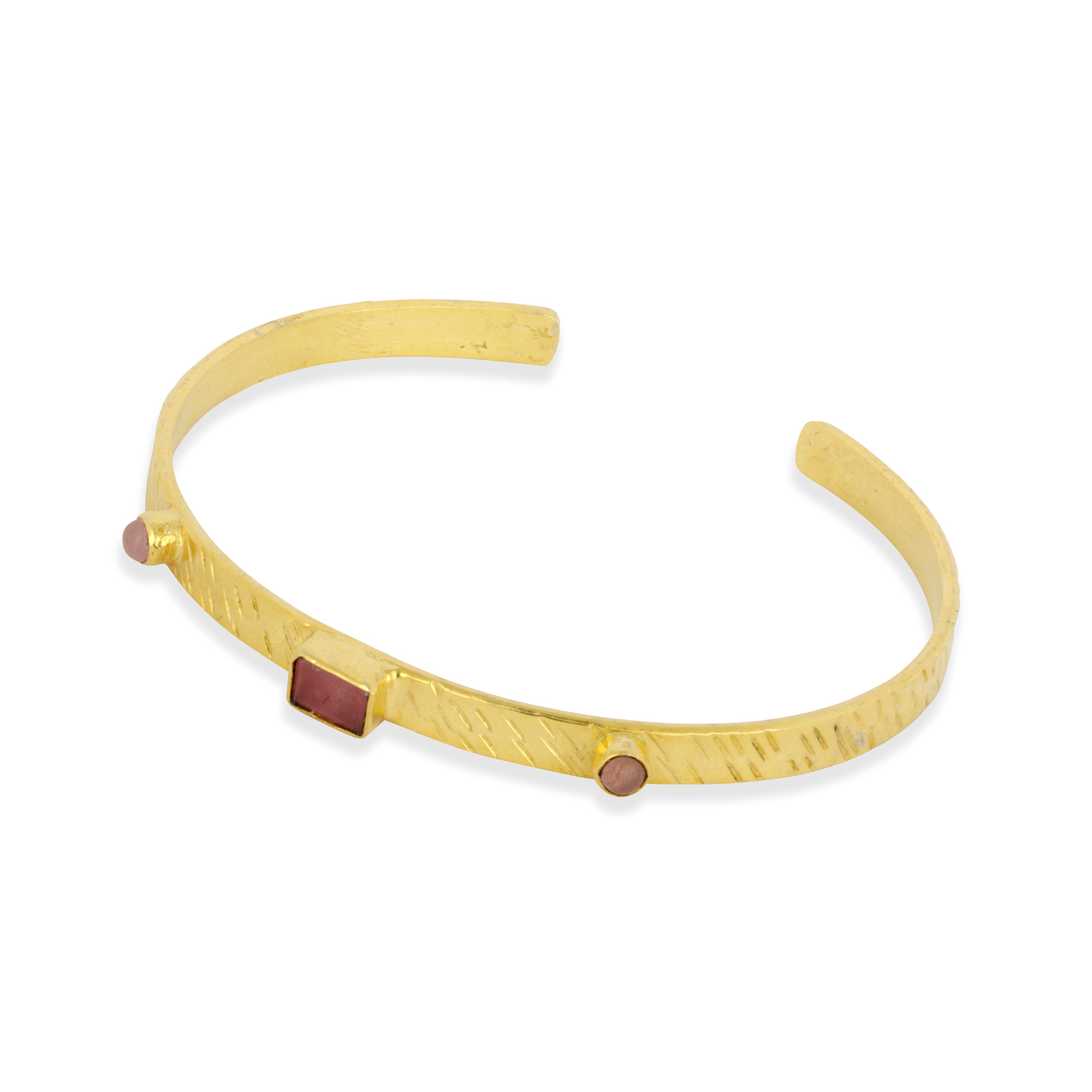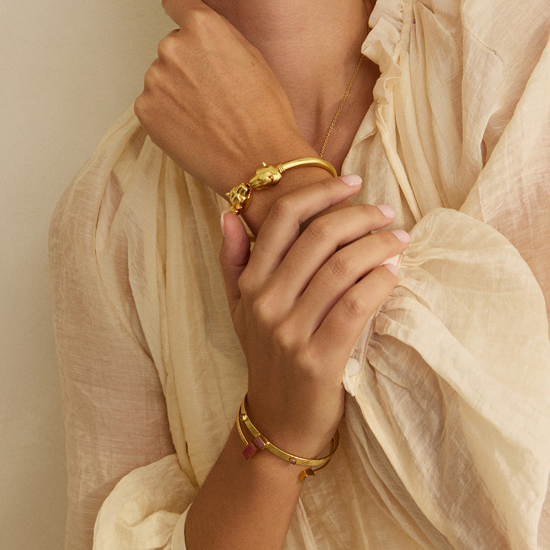 This textured gold bangle brings a pop of colour with three stunning pink jade rectangles set along the band. Mix and match it with your other favourite bangles for an effortlessly chic, layered look that's both sophisticated and full of personality.
