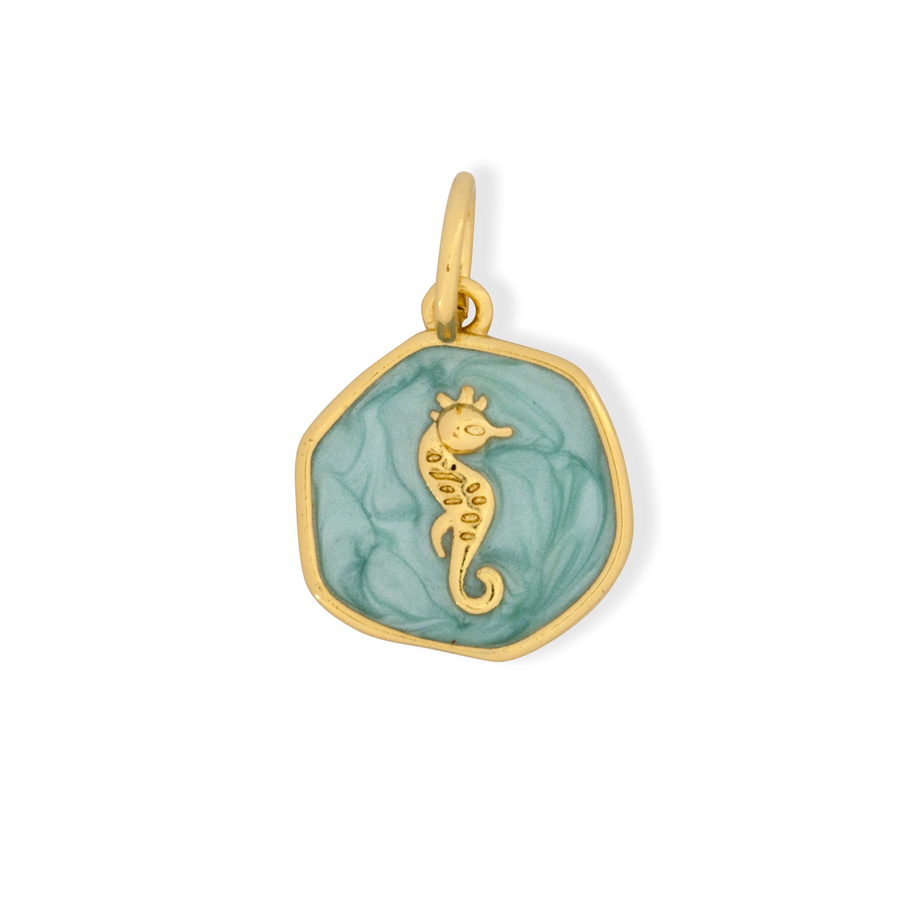 Cute enamel charm featuring an adorable seahorse nestled on a shimmering aqua coin. Perfect for customising your own jewellery designs, this tiny treasure brings a splash of oceanic charm to any creation. Mix and match with your favourite bases to craft something uniquely yours.