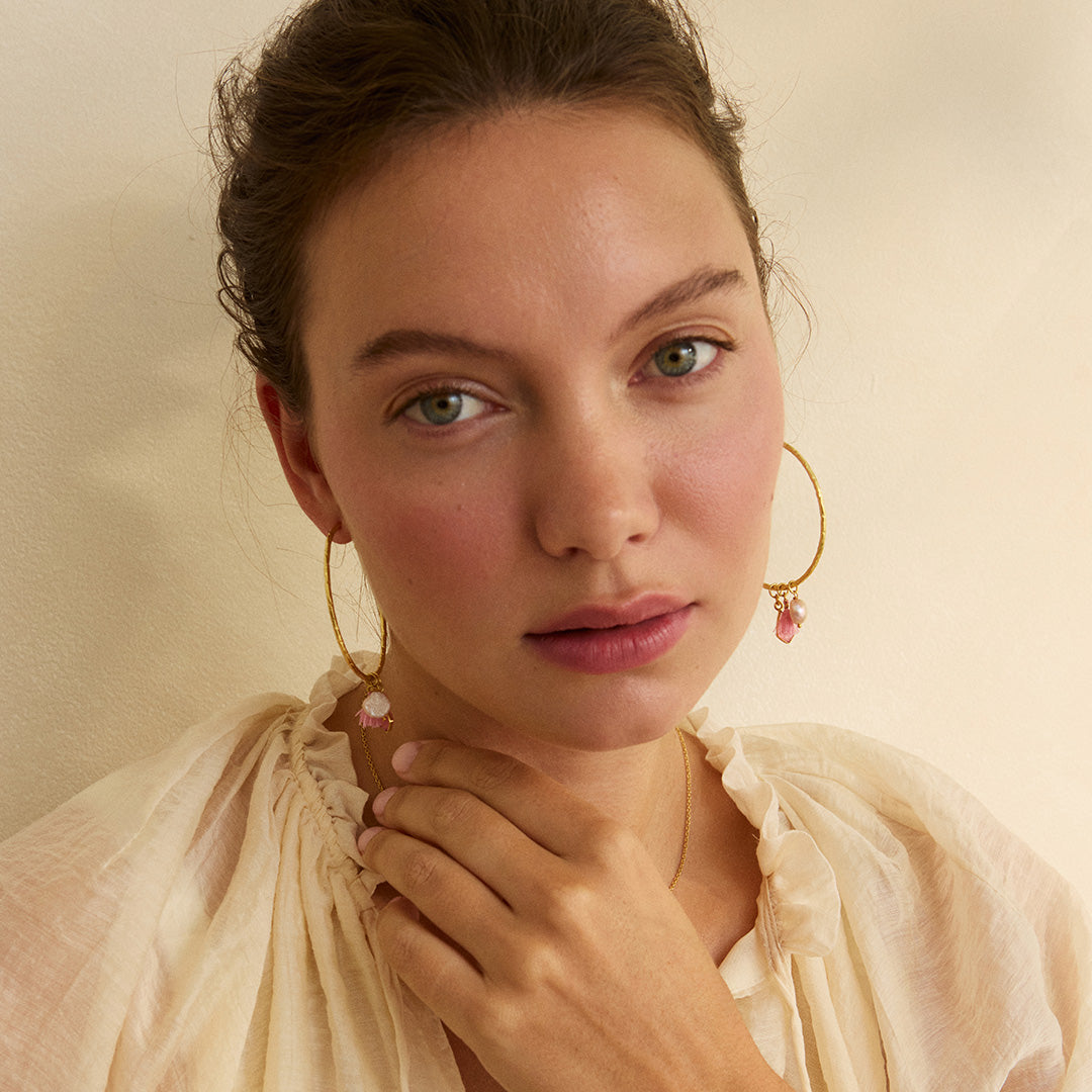 Make a statement with these versatile hoop earrings that let you switch up your style whenever the mood strikes. Featuring three delightful mini charms—pink jade, pink pearl, and a charming cotton tassel—you can mix and match to suit your vibe. Wear them solo for understated elegance or dress them up with your favourite charm. Pure styling fun in one fabulous pair.